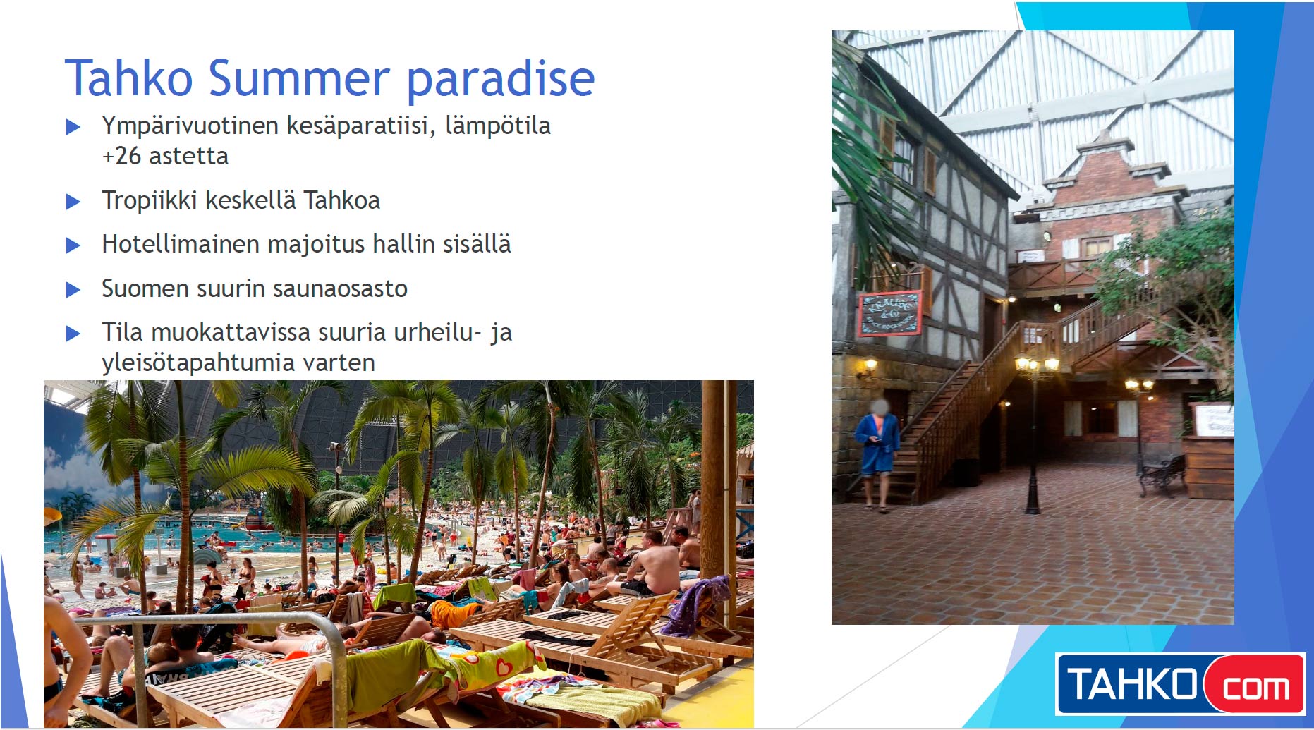 Tropiikki Mikä olisikaan sen hienompaa kuin pistää uikkarit jalkaan ja painua biitsille laskettelupäivän jälkeen. Tropiikissa tulemme takamaan +26 asteen lämpötilan ympäri vuoden. Lisäksi alueelle tulee Suomen suurin saunaosasto.